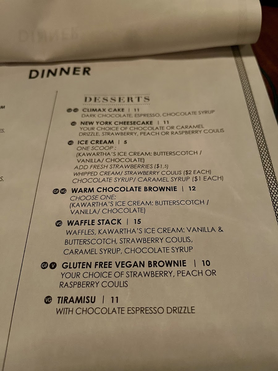 The dinner selection impresses with standout dishes like the Fish & Chips, featuring Ontario pickerel in a light beer batter, paired with twice-cooked fries and zesty lemon aioli for a truly Canadian experience. For comfort food enthusiasts, the Chicken Pot Pie is a must-try, packed with roasted chicken, vegetables, and nestled under a flaky, buttery crust. The Chicken Cavatelli, with its creamy pesto sauce, is equally alluring, making for a delightful pasta choice.